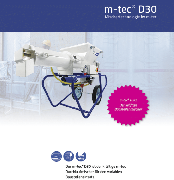 Übersicht: Der m-tec® D30 ist ein robustes Allround-Talent, das speziell für die Verarbeitung von Trockenmörtelprodukten bis zu einer Körnung von 6 mm entwickelt wurde. Als bewährtes Gerät auf Baustellen weltweit, rationalisiert der D30 den Einsatz beim Mauern sowie bei der Verarbeitung von Feinbeton und Estrichen.