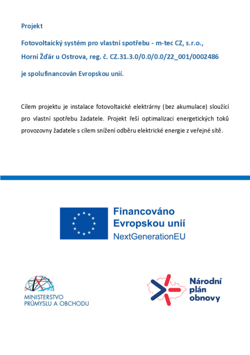 Fotovoltaický systém pro vlastní spotřebu – m-tec CZ, s.r.o., Horní Žďár u Ostrova, reg. č. CZ.31.3.0/0.0/0.0/22_001/0002486 je spolufinancován Evropskou unií
