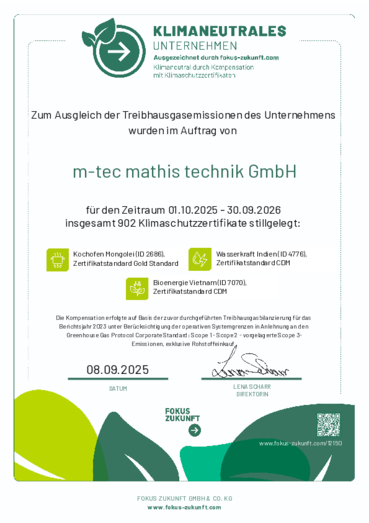 Klimaneutralität ist ein fortlaufender Prozess, der regelmäßig überprüft wird. Wir werden dabei von unserem Partner FOKUS-ZUKUNFT GmbH & Co. KG unterstützt, der uns mit seinem Know-how und seiner Erfahrung im Bereich CO2-Emissionen hilft, aktiv zum Klimaschutz beizutragen. Auch die Erhebung und der Kauf der Zertifikate wurden in Zusammenarbeit mit FOKUS ZUKUNFT durchgeführt.